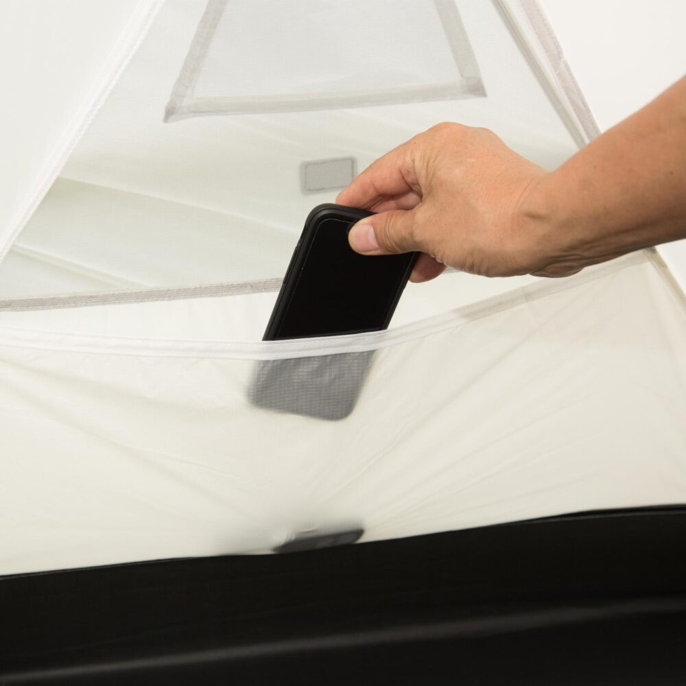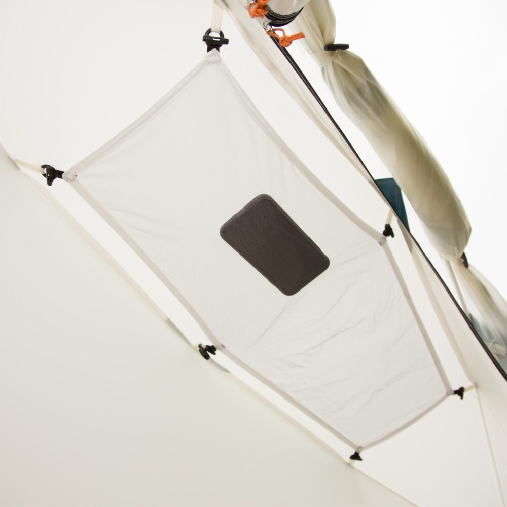 室内にはランタン用フックや、小物収納に便利なポケット、ギアハンモック等を搭載。ポールは柔軟で強度が高いジュラルミンを使用。